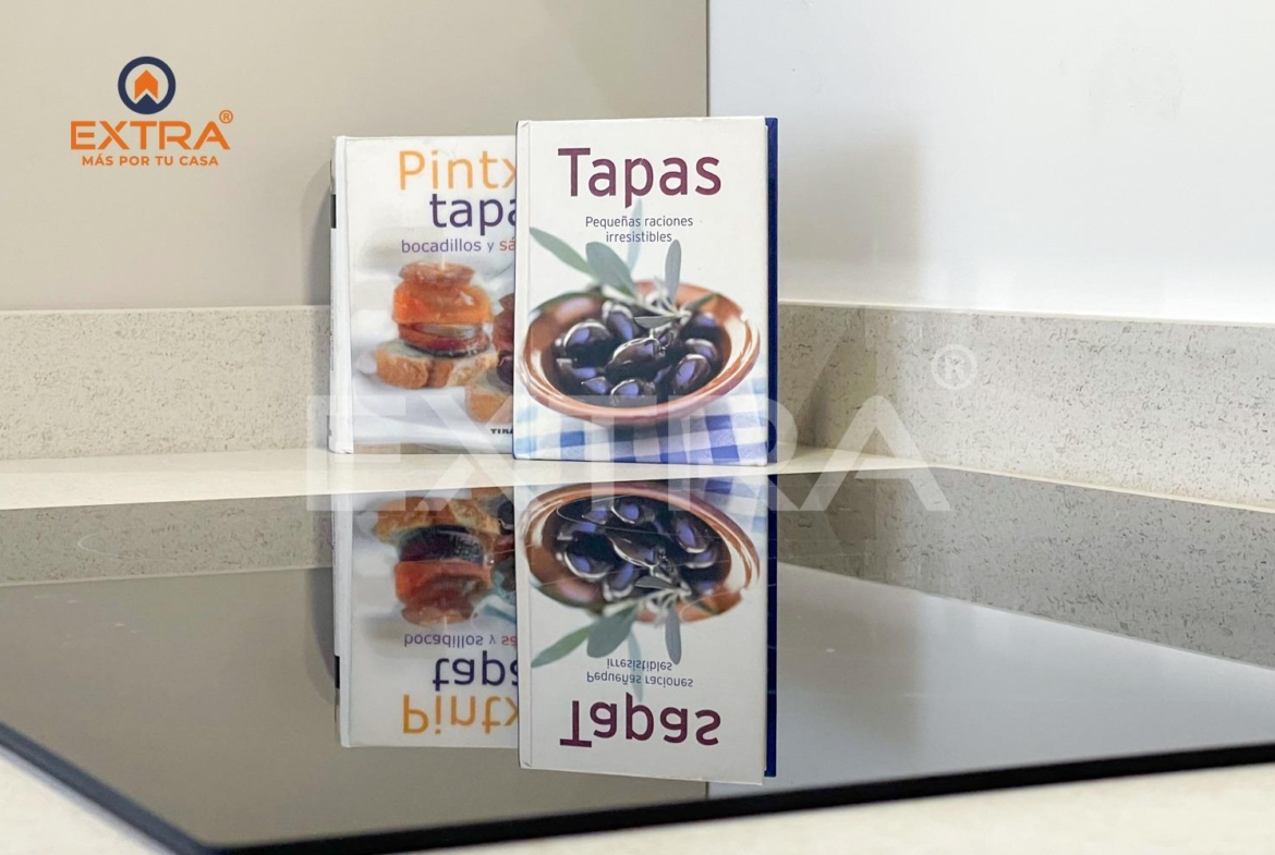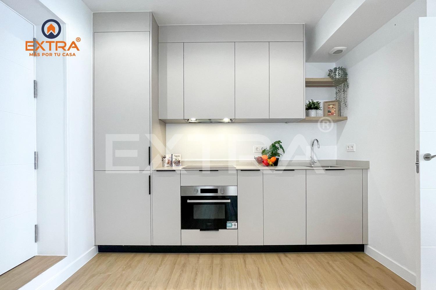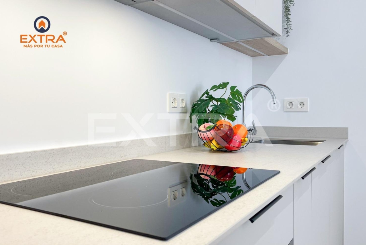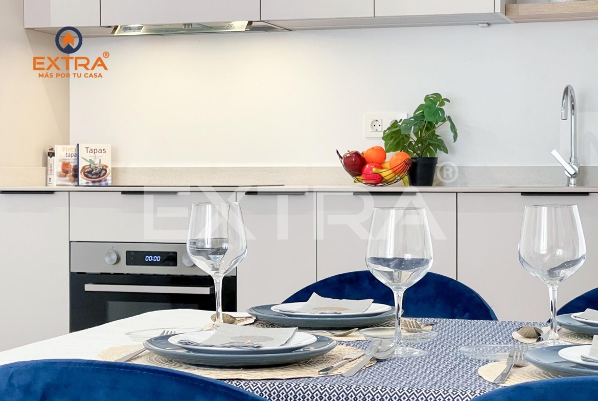 La cocina se entrega equipada con vitrocerámica, horno, frigorífico y lavavajillas. Un funcional armario ubicado en un distribuidor junto a la cocina y con puertas de suelo a techo, contiene termo eléctrico para agua caliente y lavadora.