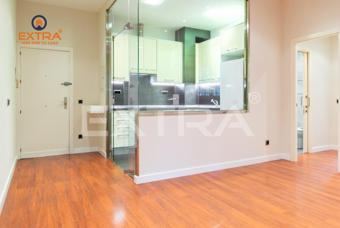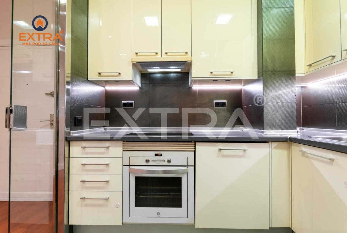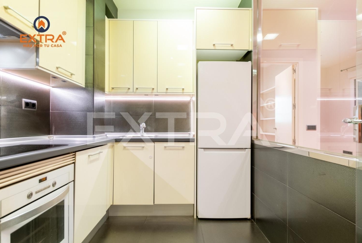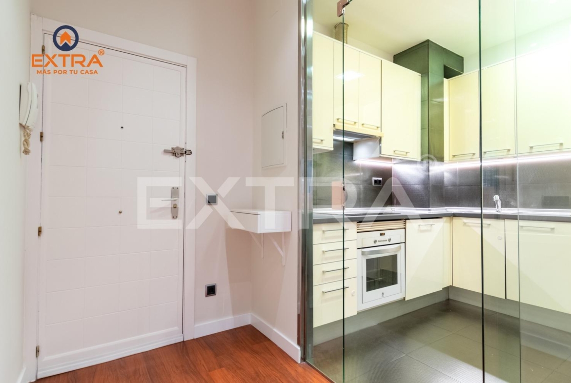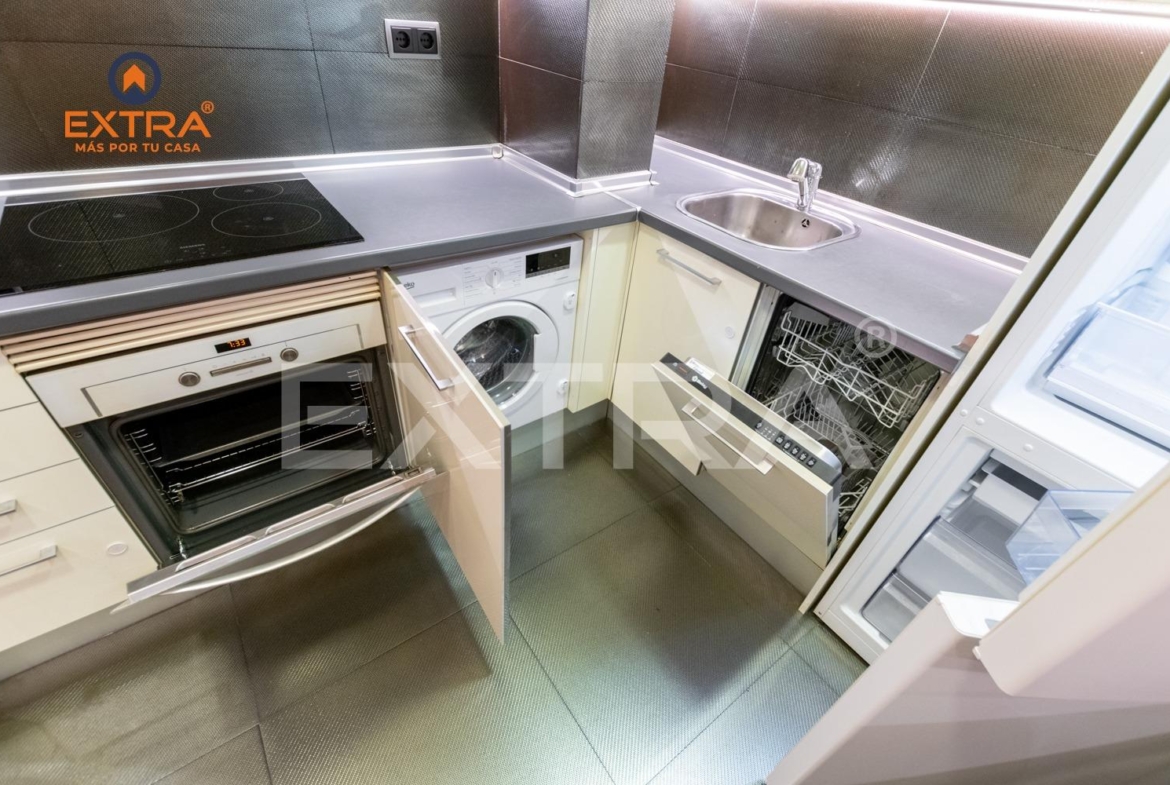 Al entrar, un acogedor hall da la bienvenida y conduce a la cocina, totalmente amueblada y equipada con vitrocerámica, horno y frigorífico. Una elegante mampara de cristal la separa del salón, aportando amplitud y luminosidad al conjunto.