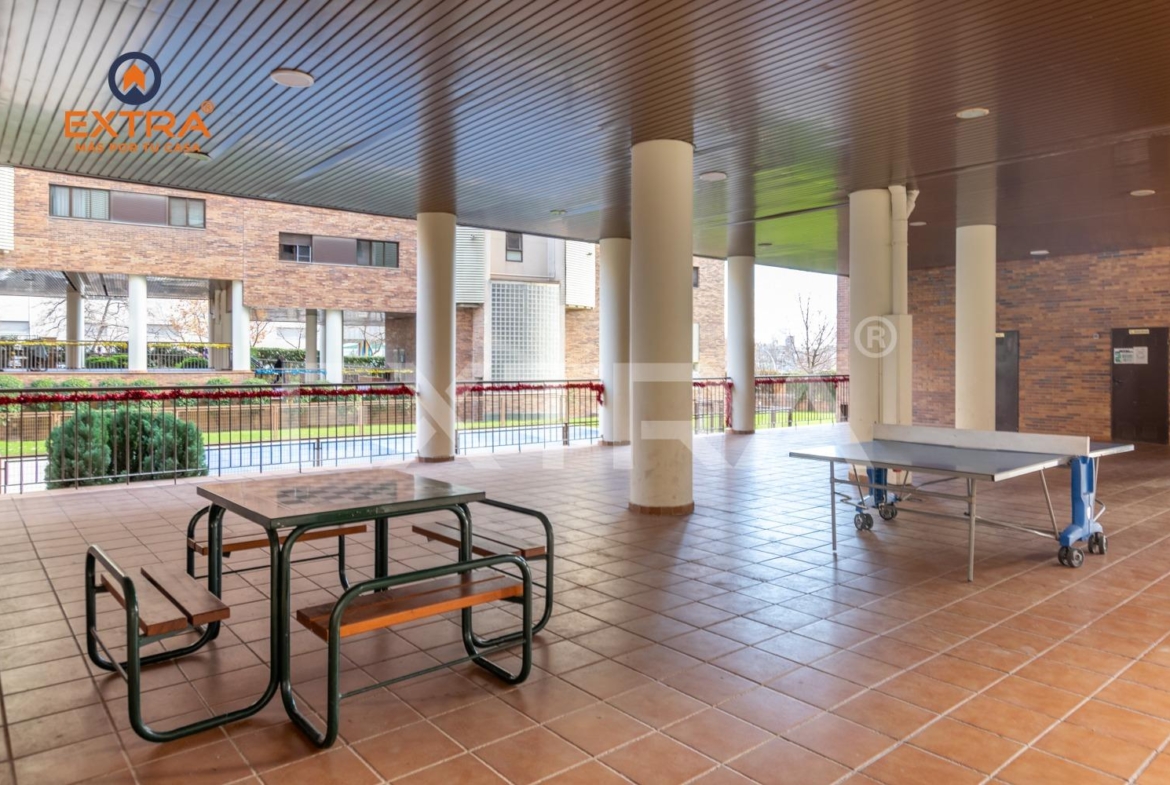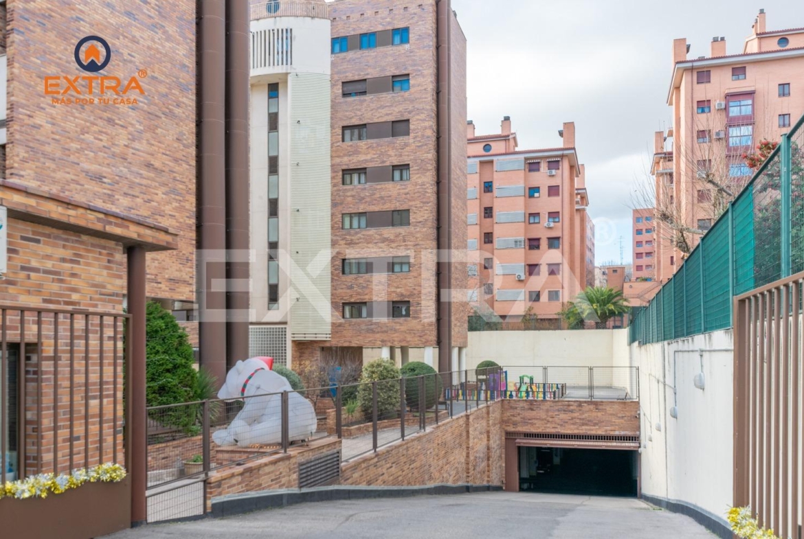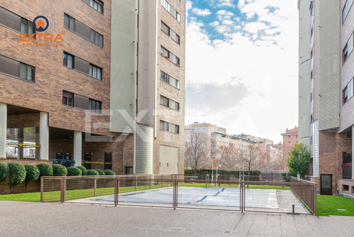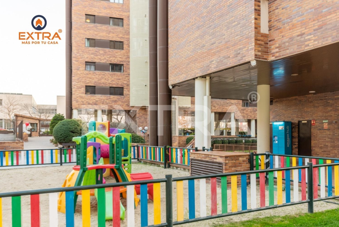 La vivienda incluye plaza de garaje y trastero, y se sitúa en una urbanización con portero físico 24 h, videovigilancia, piscina, zonas ajardinadas, parque infantil y sala de reuniones.
