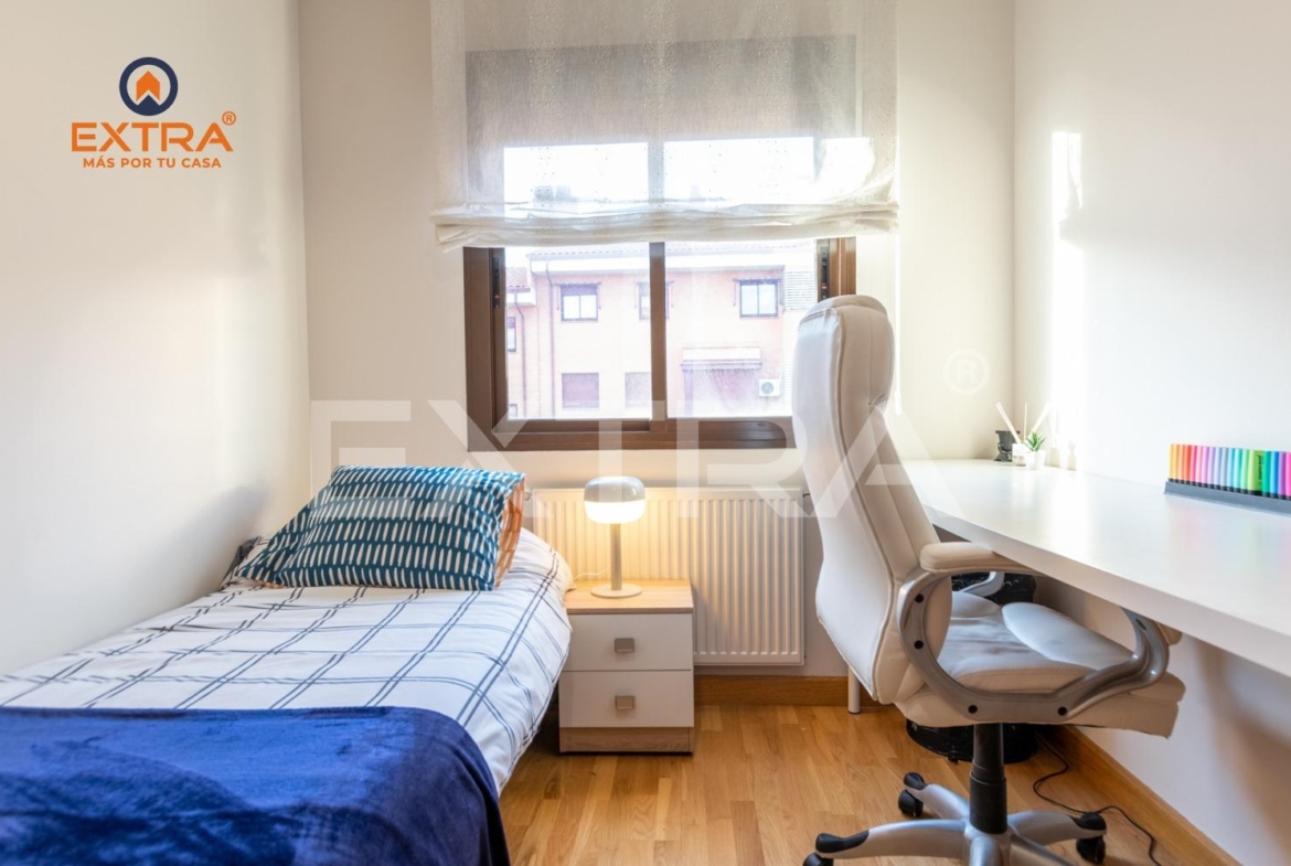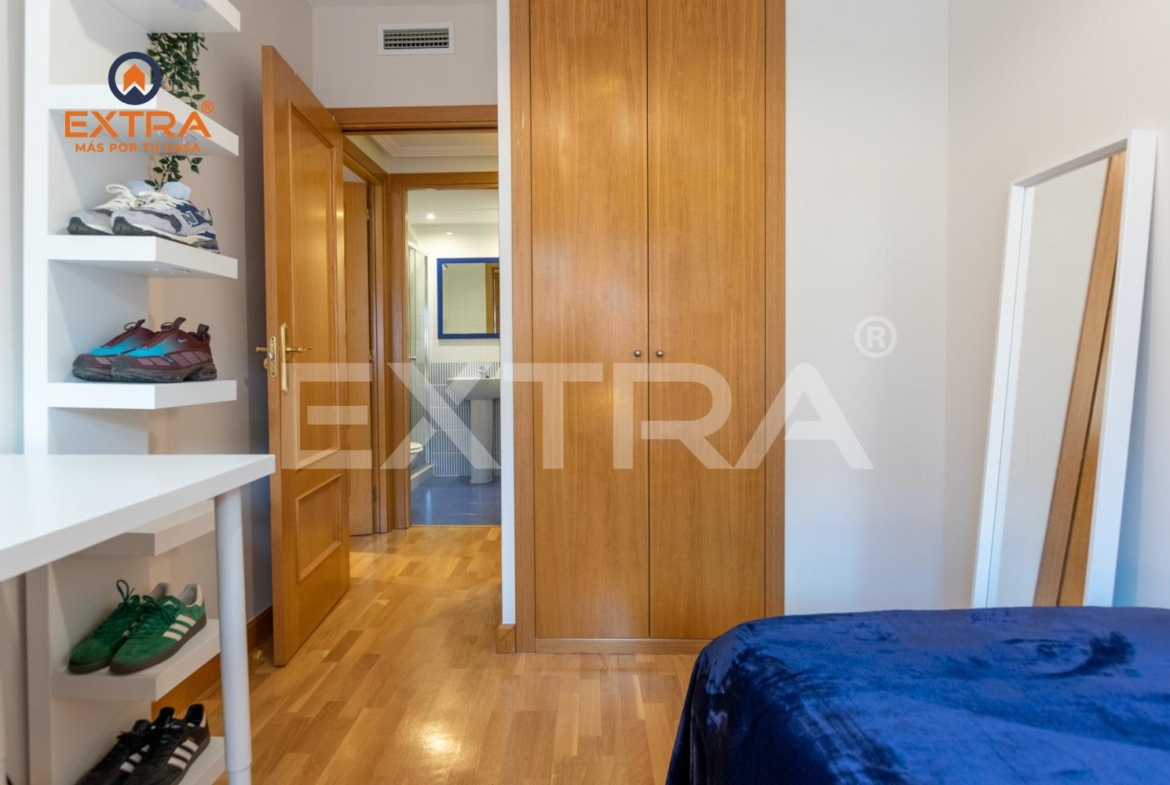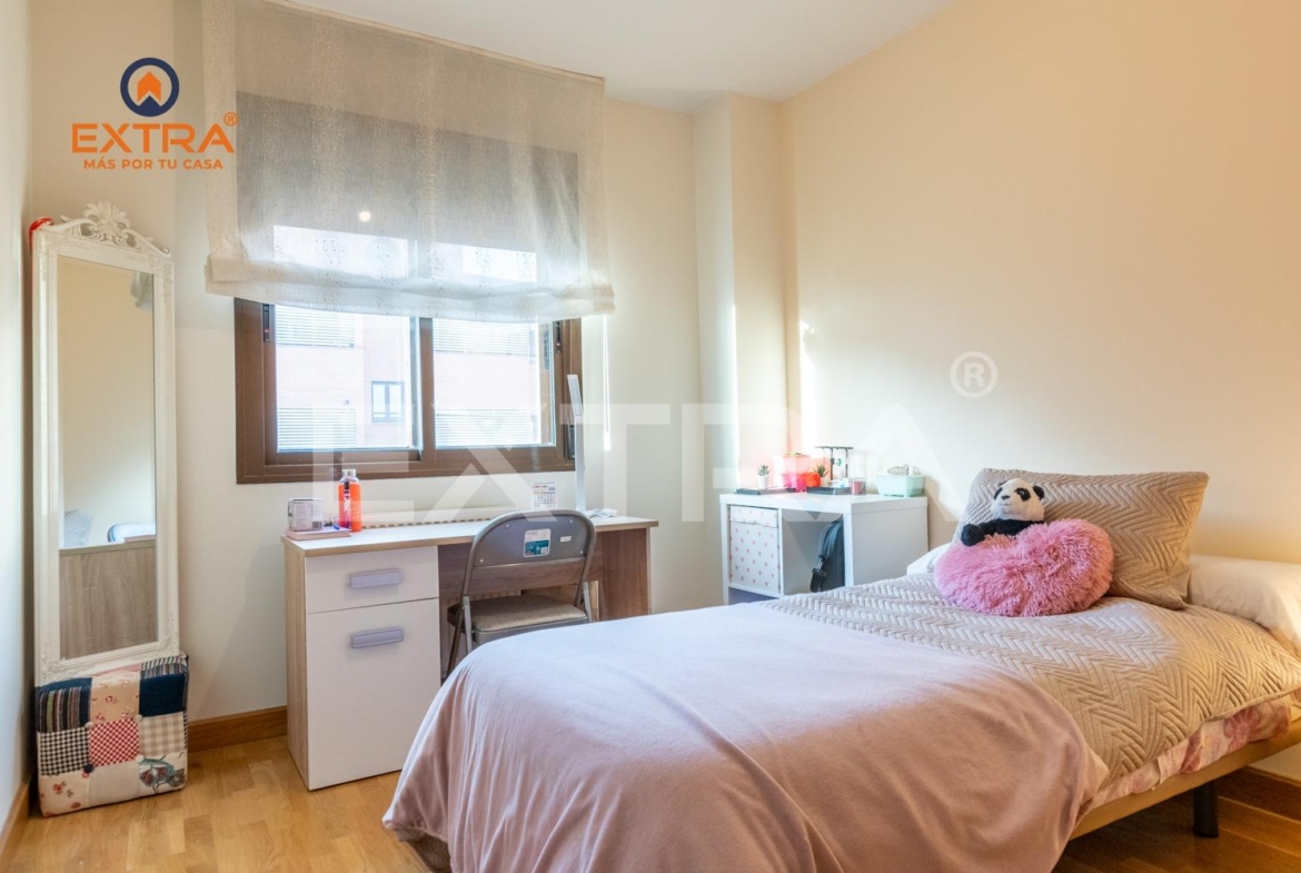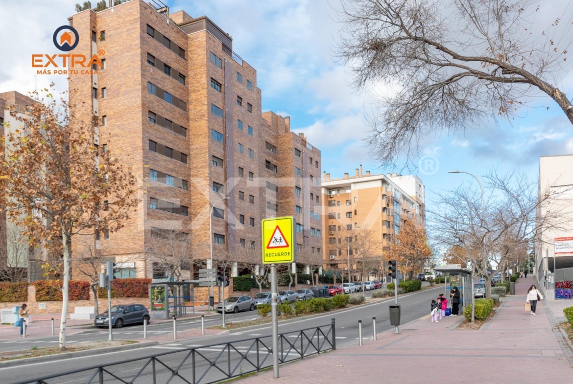La vivienda incluye plaza de garaje y trastero, y se sitúa en una urbanización con portero físico 24 h, videovigilancia, piscina, zonas ajardinadas, parque infantil y sala de reuniones.