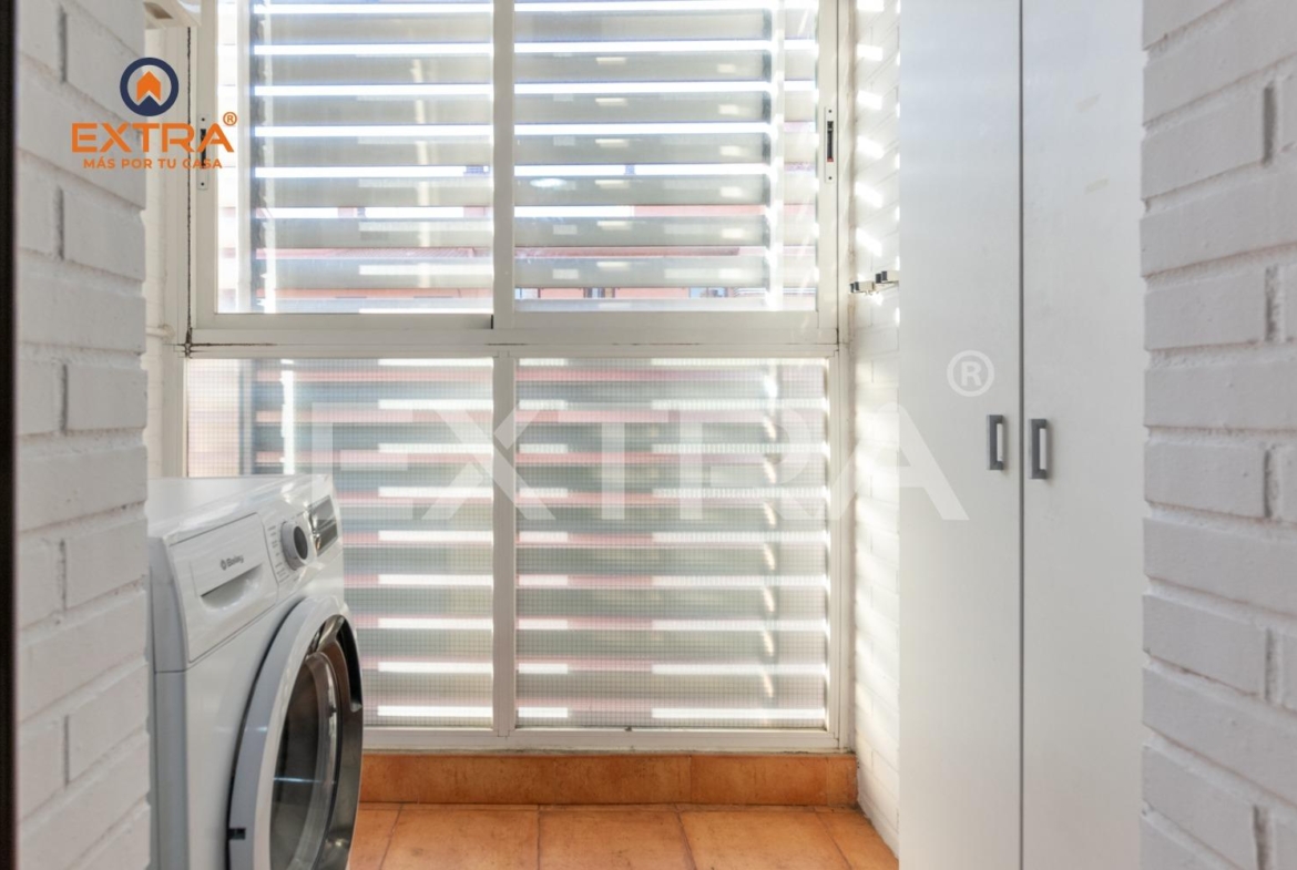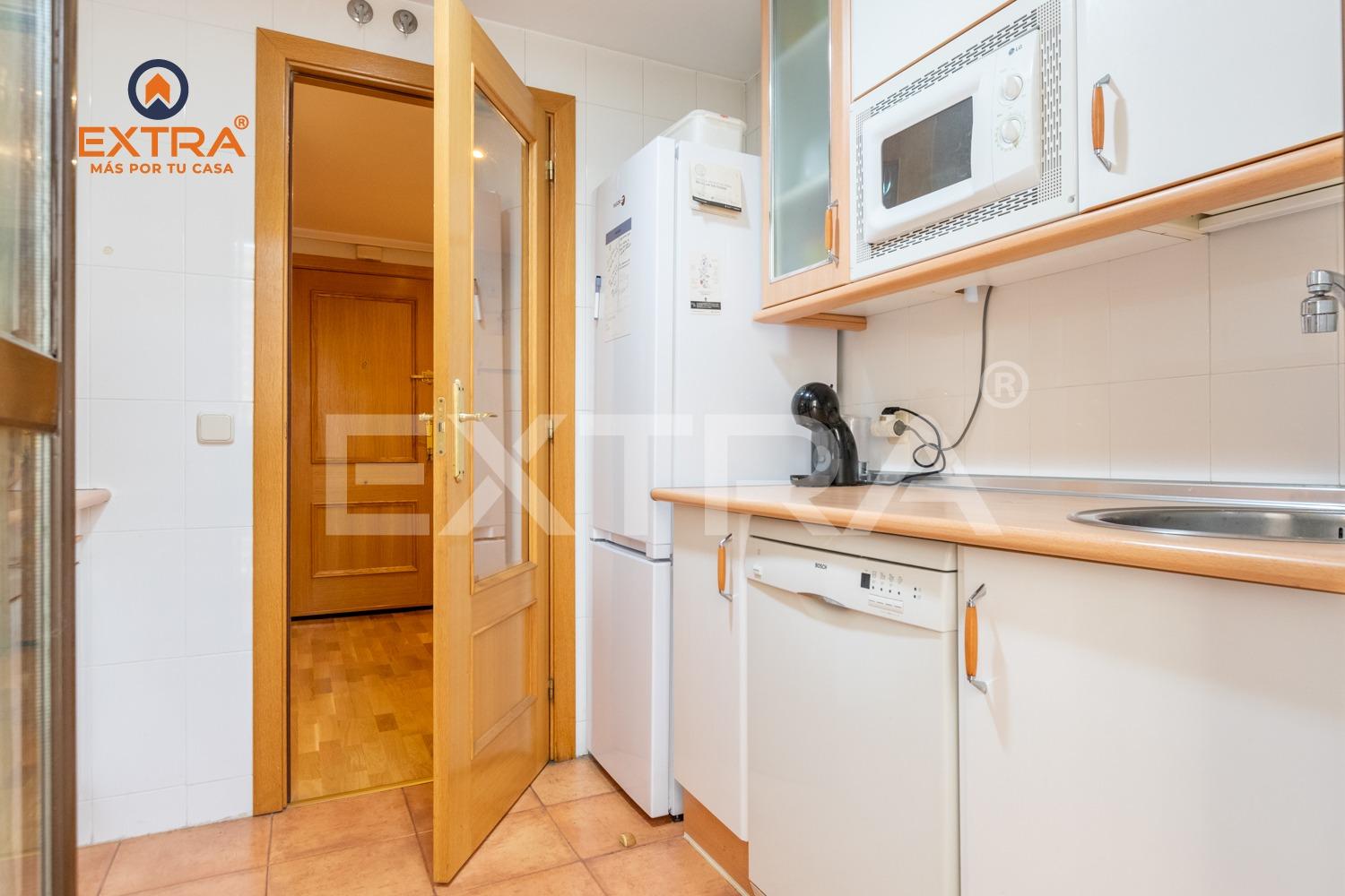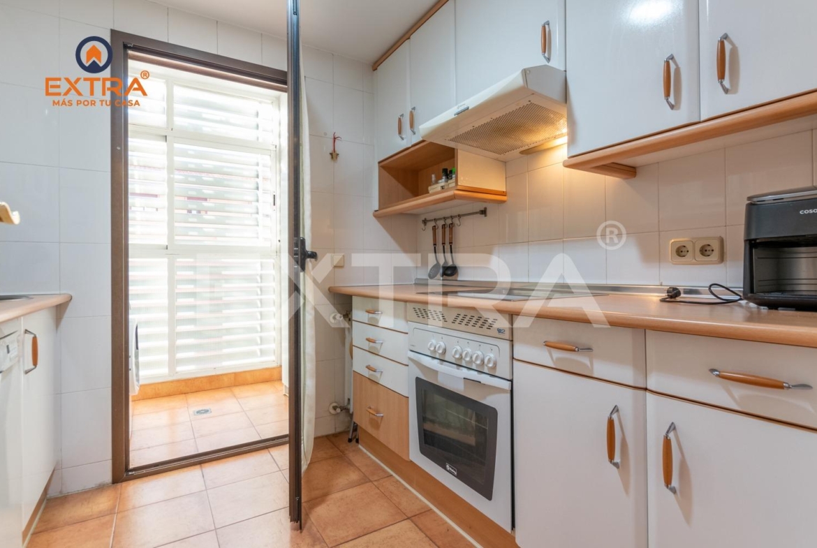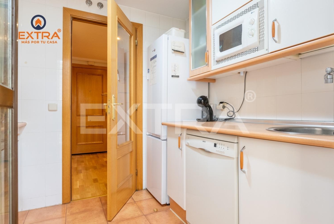 La cocina, independiente y completamente equipada, presenta una distribución muy funcional con mobiliario a ambos lados, ofreciendo gran capacidad de almacenaje y una práctica zona de tendedero/lavadero anexa, que aporta comodidad al día a día.
