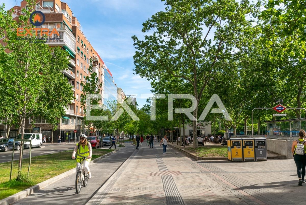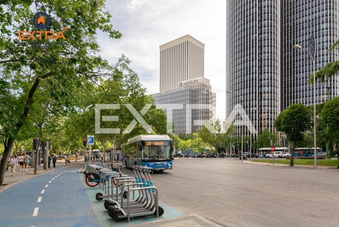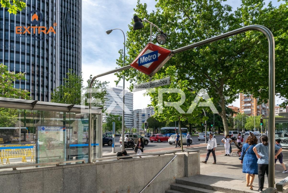 En cuanto al lugar donde se ubica, es una zona bastante apacible y tranquila, y a escasos metros de calles principales como General Perón, Orense, Castellana, AZCA, que ofrecen una gran variedad de establecimientos cubriendo las necesidades básicas del día a día, supermercados, restaurantes, centros médicos, parques, El Corte Inglés, Modas Shopping. En cuanto a comunicaciones, tienes las estaciones de Santiago Bernabéu (línea 10) Estrecho (línea 1) y Nuevos Ministerios (Líneas 10, 6, 8, que va directa al Aeropuerto, y cercanías RENFE) y autobuses 3, 5, 27, 37, 66, 124, 127, 149… todos a menos de 5 minutos.